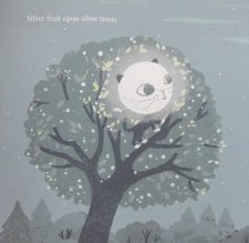 The illustrator imbues the whole thing with dreamy magic as she portrays the moon as feline, tiptoeing among the silver fruited tree branches, and then across the ground pursued by two small children and a host of faery folk, past the log-like sleeping dog …