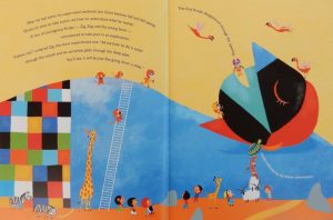 Kandinsky’s dreamlike abstract paintings were the inspiration for this unusual picture book and in an afterword, both author, Massenot and illustrator Nille talk about how his Sky Blue in particular gave them space within which to let their own imaginations get to work. We also learn something of Kandinsky’s interest in physics, in particular Einstein’s theory of relativity and its possible influence on the artist’s painting.