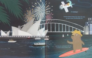 Before long. ‘Up ahead is something bright – it’s a city’s shining lights …’ Paris is the next stop where having looped around the Eiffel Tower, Emma Jane spies on Notre Dame, a rooster and …’So Emma Jane in her aeroplane, / a fox who doesn’t like the rain, / and a rooster who crows wherever he goes / fly on.’ … towards Venice and thence New York, Beijing and Sydney.