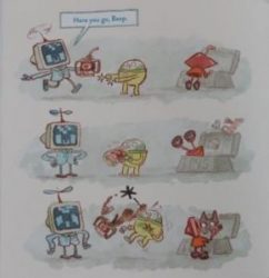 The crazy, occasionally slightly confusing, visuals of the romp, in tandem with those colour-coded speech bubbles, offer a wonderful opportunity for readers aloud (and young listeners), to engage in robot-speak. A word of warning though: if you share this as a bedtime book, it might well lead to rather too much child-robot talk and as a result, insufficient infant wind-down.