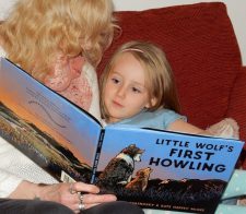 Little Wolf accompanies Big Wolf to the top of the hill, both father and son eagerly anticipating the wolf pup’s first howling. The full moon appears above the hill top and Little Wolf can hardly hold on to that first howl of his but first he must let his father demonstrate “proper howling form.” Then comes the turn of the beginner: he starts conventionally but then adds a little bit extra of his own.