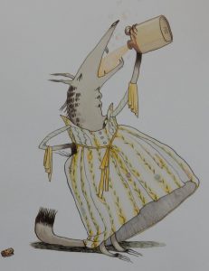 The usual exchange follows about the size of eyes and ears, but when teeth are mentioned, it’s time for Little Red to do some quick thinking: and the wolf some quick drinking …