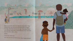 It’s the day for Jabari to jump off the diving board, so he tells his dad when they reach the swimming pool. “I’m a great jumper, so I’m not scared,” he says.