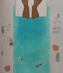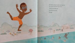 to the joyous after the jump, family celebration in the pool are wonderfully observed and her narrative is pitch perfect. Look closely at the beautifully patterned illustrations and you’ll find other small stories to enjoy too: there’s a boy in the queue, with a ladybird on his arm; another having sunscreen applied by an adult and looking none too happy about it; the ball game in the pool below Jabari.