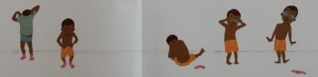 But then, at the bottom of the long ladder, the delaying tactics begin: he allows another child to go in front of him in the queue; he needs to think about the “kind of special jump” he’ll do. Dad is empathetic suggesting a “tiny rest” before the ascent after which, Jabari remembers his stretching regime and again Dad endorses his idea. Then it seems as though the whole thing is going to be postponed until another day; but then Dad’s timely “It’s OK to feel a little scared,” and further words of wisdom finally give him that much needed confidence boost. After a deep breath, Jabari begins to climb up and up and up and up.