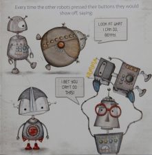 The little robot is taunted by his fellow robots who love to show off their button-activated skills.