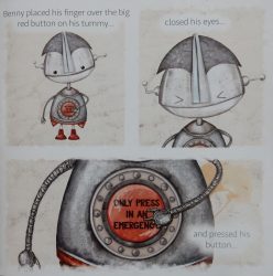 Benny’s planet is populated by robots; robots of all shapes and sizes, and each with an array of multi-functional buttons. Benny though is different: he has just a single, central button, a large one bearing a warning that it’s only to be used in an emergency,