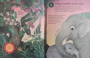 I didn’t need any persuasion to love elephants mainly because of frequent encounters with the Asian variety on my numerous visits to India. (I’ve never seen any with googly eyes however.) In addition to the reason that gives each spread its title, there is plenty more to enjoy. I was fascinated to learn that elephants ‘wrap their trucks around each other in warm greetings’ and that ‘they understand how other elephants feel.’ Here for example one can see a beautiful Indian swallowtail butterfly, a common rose butterfly and a common bluebottle butterfly among the flora.