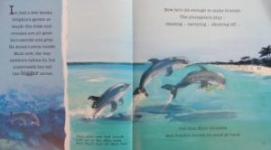 The text uses two fonts: the large provides the narrative with additional facts given in smaller italics; and the final spread reminds readers that dolphins need protecting from pollution, from over-fishing and from the careless use of fishing nets.