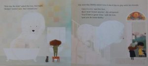 Caro and her mum move to a new house in a new neighbourhood. Then, into the whiteness of everything comes a snowy lion inviting Caro to play hide-and-seek. Their play fills her day bringing cheer instead of loneliness; but can this new animal friend encourage her to venture outside and have fun with the local children?