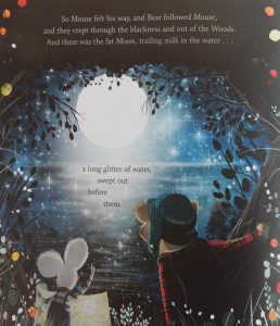 He tunnels, climbs and clambers up into the blackness of the woods. Suddenly, as he’s urging himself forwards who should emerge from the shadows but his ursine pal. Once again his help is refused, although Mouse cannot, so he admits, see his map in the darkness: but Bear responds with “I know, Mouse, … But I’ve got you, and you’ve got me – so we’ll be all right.”