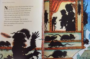 Ten illustrators have been used with Victoria Assanelli and Bee Willey having two tales each. Most arresting as far as I’m concerned are Ian Beck’s wonderful silhouettes for Adèle Geras’ rendition of The Pied Piper.