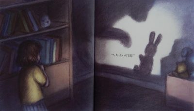 Then dashing in fright from her room the child runs straight into the waiting arms of her mother. “A monster ate Bunny!” she sobs.