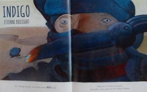 Every spread is worth lingering over and I find it well nigh impossible to choose a favourite but for its brief potency I particularly loved Etienne Delessert’s Indigo: ‘The Tuareg nomads wear long cotton indigo veils. They herd camels and goats and talk to the spirits of the Sahara Desert.’