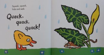 Observant listeners will more than likely have noticed that at every turn of the page, the rain is easing off until … ‘No more drips. No more drops.’ Suddenly Ducky feels sad and heads off to find Dad.
