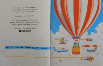 Off he goes in search of a Peopley Person to roar, rage and rant at, but all he can see in the desert is vampires and a witch. The forest is equally unpeopley as is the ocean and as for the sky, that’s full of spooky characters zooming through the clouds in various aeronautical machines.