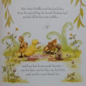 His Mummy Duck however, has taken steps to ensure things go smoothly. She offers words of reassurance and packs into his school bag things that will remind him that she’s never far off: one of her soft feathers, his favourite nibbles, some biscuits to share with his friends