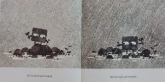 With his characteristic minimalism Klassen imbues his art with humorous detail: the twig for instance that looks like a wilted aerial on Square’s head, and the way he just keels over in utter exhaustion, are superb.