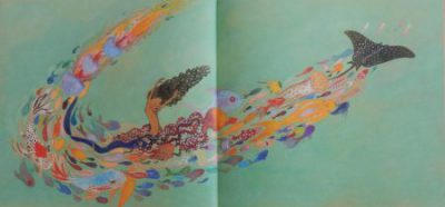 We then join him in a wordless 3-spread daydream that shows the boy becoming a mermaid swept along in a mass of sea creatures.