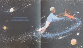 In summer Grandad buys a wooden racing track (second hand with bits missing) and together they play, sometimes zooming the cars up into space. This action triggers the narrator’s second imagined scenario to make her granddad happy.