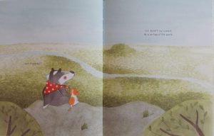 Then comes a day when Mrs Badger doesn’t feel strong enough for an uphill hike so Leo heads off alone. And so it continues with the cat bringing back treasures to share with Mrs Badger.