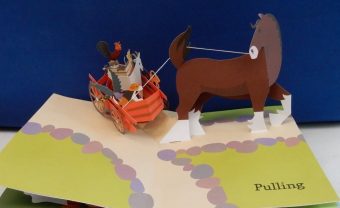 As each spread is opened readers are treated to an incredibly intricate equine scene that literally leaps in one direction or another from the page, and is captioned by a single word be that racing, resting, jumping, grazing,