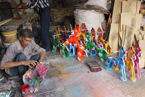 A few years ago my artist friend Shahid Parvez specially ordered 500 plain horses from the two men, These were painted by school children from all over the city and exhibited in the grounds of Udaipur City Palace. Shahid hoped to make parents stop and think and perhaps encourage them to provide toys like this instead of letting them play all the time on tablets and mobiles. For a short while the sales of the horses rose dramatically but now again, nobody seems interested.