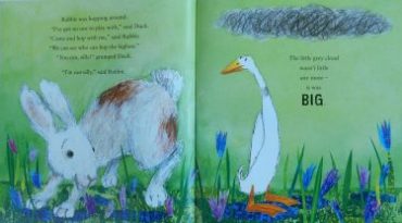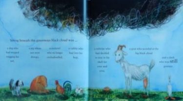 Off she goes to seek one, her first request being directed to Dog. Dog is more than willing so long as Duck will join in with some messy hole digging. Duck, having no wish for filthy feathers turns down the offer, thus increasing the size of the little grey cloud that is accompanying her.