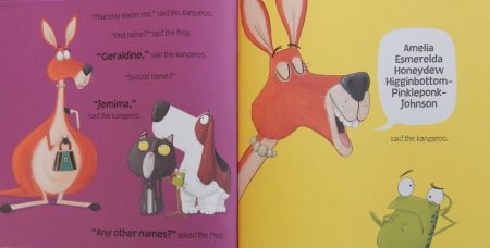 Now he’s faced with not just the creature from the title but a whole host of other animals all wanting to know upon what they can sit and even worse, each one has a name that’s impossible to find a rhyme for – try hedgehog, say. Well perhaps the spiky creature could sit upon er, Frog. Ouch! I suspect that’s completely out of the question though. And kookaburra – hmm! Surely there must be another way of approaching this impasse. And happily there is!