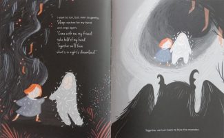 Once more come Sleep’s friendly, reassuring words making the darkness feel less scary. Till, full of menace a monster looms,