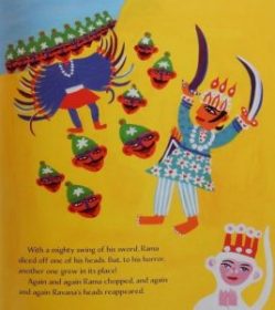 With the help of Hanuman and his monkey army, who build a bridge across from the mainland, Rama rescues Sita from the island whereon Ravanna is holding her prisoner. First though, a terrible battle is fought on that island between the monkey army and the wicked demon army until finally an arrow from Rama’s bow pierces the chest of the ten-headed demon Ravanna who falls down dead.