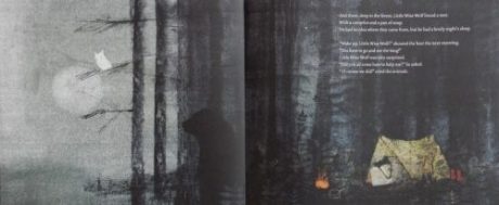 Using a largely muted colour palette, she portrays the red-booted lupine’s journey to real wisdom in a series of wonderful spreads, each of which offers details to amuse and delight. In addition to the standout red wellies that draw the eye immediately, there is a white dotted line tracking the path Little Wolf takes. Peer into the depths of each scene and you’ll discover much more.