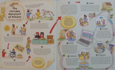 Where does the water in the tap come from?’ presents the water cycle while ‘The invisible Movement of Millions’ takes readers through the change from commodity trading, through coin currency to bring it right up to date with the electronic transfer of money via computer.