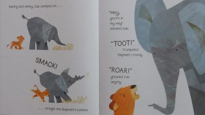 All the other animals have their own ways to deal with their anger. Zebra and Gnu let theirs out by stamping and stomping; Rhino bashes and crashes; Hippo splatters and splashes but when Cub tries he ends up with an injured paw, an unpleasant aroma and even more anger.