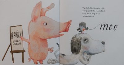 His oink, moo, meow, meh and hee-haw result in the arrival of the corresponding animals until the little bird is surrounded by new friends though there’s not a bird among them.