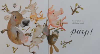 Both adorable and suddenly, funny, this book is sure to have your little ones giggling in delight and enthusiastically joining in by yelling the names of the farmyard animals that little bird emulates and making their sounds. Doubtless they’ll also enjoy attempting the ‘deafening’ parp!