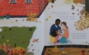 There’s parental love expressed both outdoors and in: love of a playful loyal pet; love of friends whatever the weather;