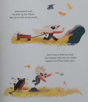 Next morning they all think hard and together come up with a possibility: something sweet, happy and to share. Ice-cream fits the bill thinks June; and having whispered sweetening formula over the cartons, she sets out eagerly and very fast, in search of her friend.