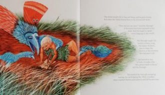 Then father and son (with some special feathers from the phoenix’s tail) travel home to be welcomed by an overjoyed mother. He adds a fiery phoenix feather for protection to his new crown