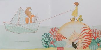 What adult wouldn’t want their child/ren to gain access to such a place – this extraordinary and wonderful world created by the imagination of the intense, creative little girl. A place where they too can wander, or pause awhile, letting their imaginations soar, further fuelled by the vivid scenes conjured by Seng Soun Ratanavanh in her watercolours, coloured pencils, and red thread stitched illustrations (which serve both to link together what the narrator imagines and to leave gaps for readers’ imaginations to enter).