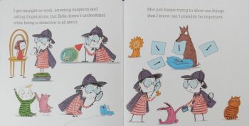 Ella’s hilarious scenes of Sophie and her assistant on the case provide the perfect foil for the droll text; and do look carefully at the back cover whereon Sophie’s library is shown.