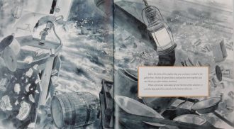 In contrast, Bagram Ibatoulline’s superbly moving, equally realistic, watercolour scenes show the sometimes glowing, sometimes shadowy shore whereon Thomas, aided by the magnifying glass, makes his discoveries of mysterious magical ocean gifts and lets his imagination soar.
