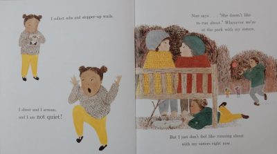 Then slowly, slowly she finds that she can be that chatty self with others as well as when she’s alone; and she can play with her sisters again, sharing feelings and imaginings, alone no more.