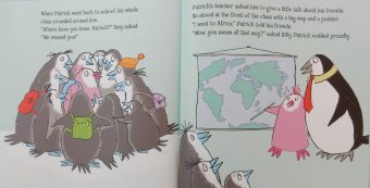 At school, his fellow penguins tease Patrick until he’s had enough. Deciding he wants to fit in, he packs his rucksack and sets off to find the African flamingos his Dad had showed him in a bird book.