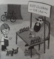 Then comes the disappearance of the remains of the raspberry pink food colouring he’ll need for his competition cake and when he goes out to buy some more, all the shops have mysteriously sold out and the only place he can find any is …