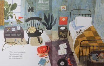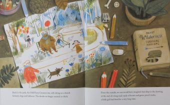 From the outset (there’s the soft toy in her bedroom basket on the first spread), there have been allusions to Sendak’s Where the Wild Things Are – a visit to a dreamlike wild place, safe yet without parental interference, from which she’s called back from her imaginary journey – the journey that she has all the while been drawing on her paper; even Sala’s colour palette is similar to Sendak’s.