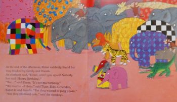 Next morning when he takes his walk, Elmer’s slightly puzzled at the way his friends greet him. Throughout the day the other animals seem to be avoiding him until the end of the afternoon when he’s suddenly confronted by all his friends and family.