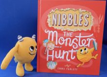 Uh-oh! Emma Yarlett’s Nibbles, the monster is on the loose again and he’s managed to find his way into a little boy’s bedroom where quite clearly, he’s been indulging himself with the furnishings and his favourite fodder, books. Not just any books however but the boy’s very favourite information book.