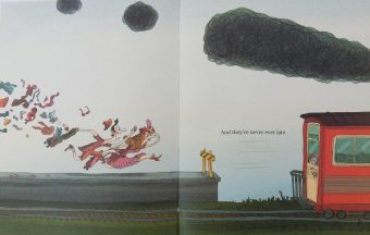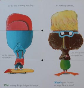 This is a mix-and-match book wherein Tallec, in his typical skittish manner, invites readers to engage in storying with a weird and wonderful cast of characters – animal and a couple of human ones – all of which are sporting rather ridiculous headwear.