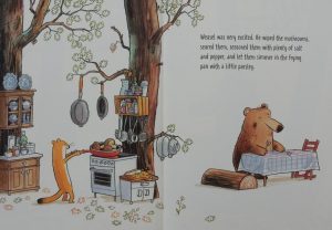 From that small beginning grows a fully-blown fight: Bear found the mushrooms, Weasel cooked them perfectly; it was Bear’s recipe but Weasel’s favourite food and his tummy is rumbling; Bear’s stomach is bigger and with it her hunger; Weasel mentioned a rumbly tummy first; Bear wanted the extra mushroom first, she says and insults start flying. This prompts Weasel to procure mushroom number three and wave it aloft just as a fox happens to be passing by with its eye on the tasty tidbit.